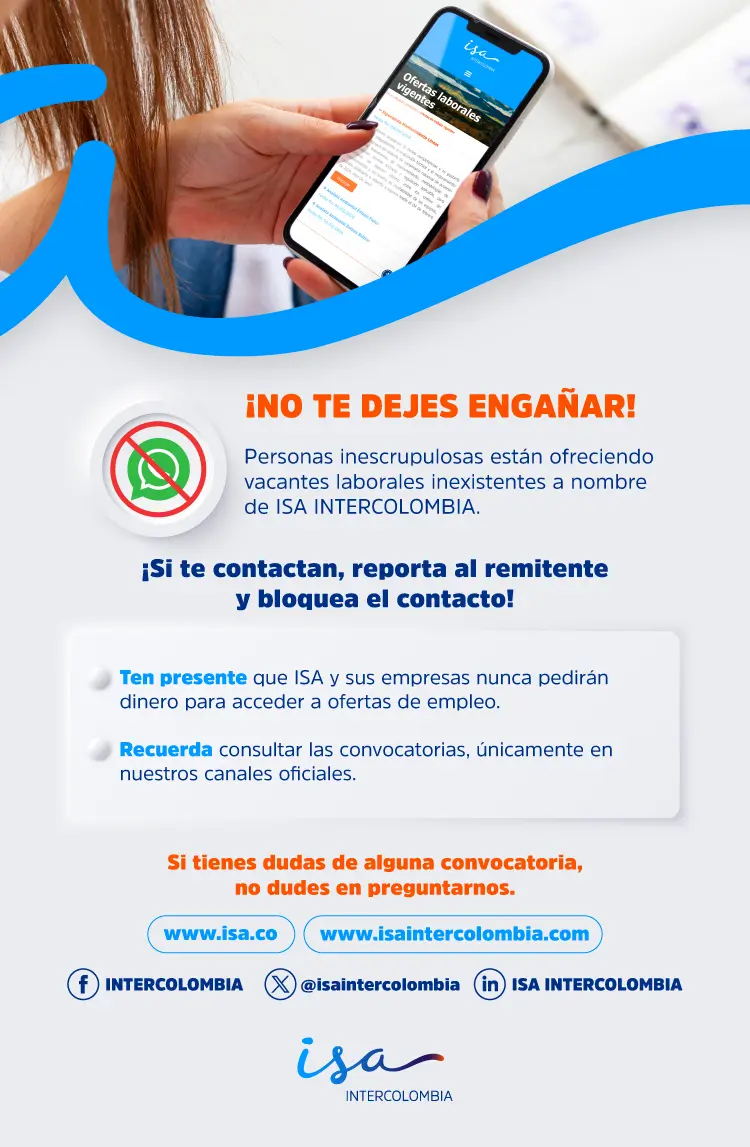 Personas que no pertenecen a nuestra organización ni trabajan para ISA INTERCOLOMBIA, están contactando a ciudadanos por WhatsApp y redes sociales para engañarlos, ofreciendo vacantes de empleo inexistentes a nombre de nuestra compañía o sus trabajadores a cambio de dinero.