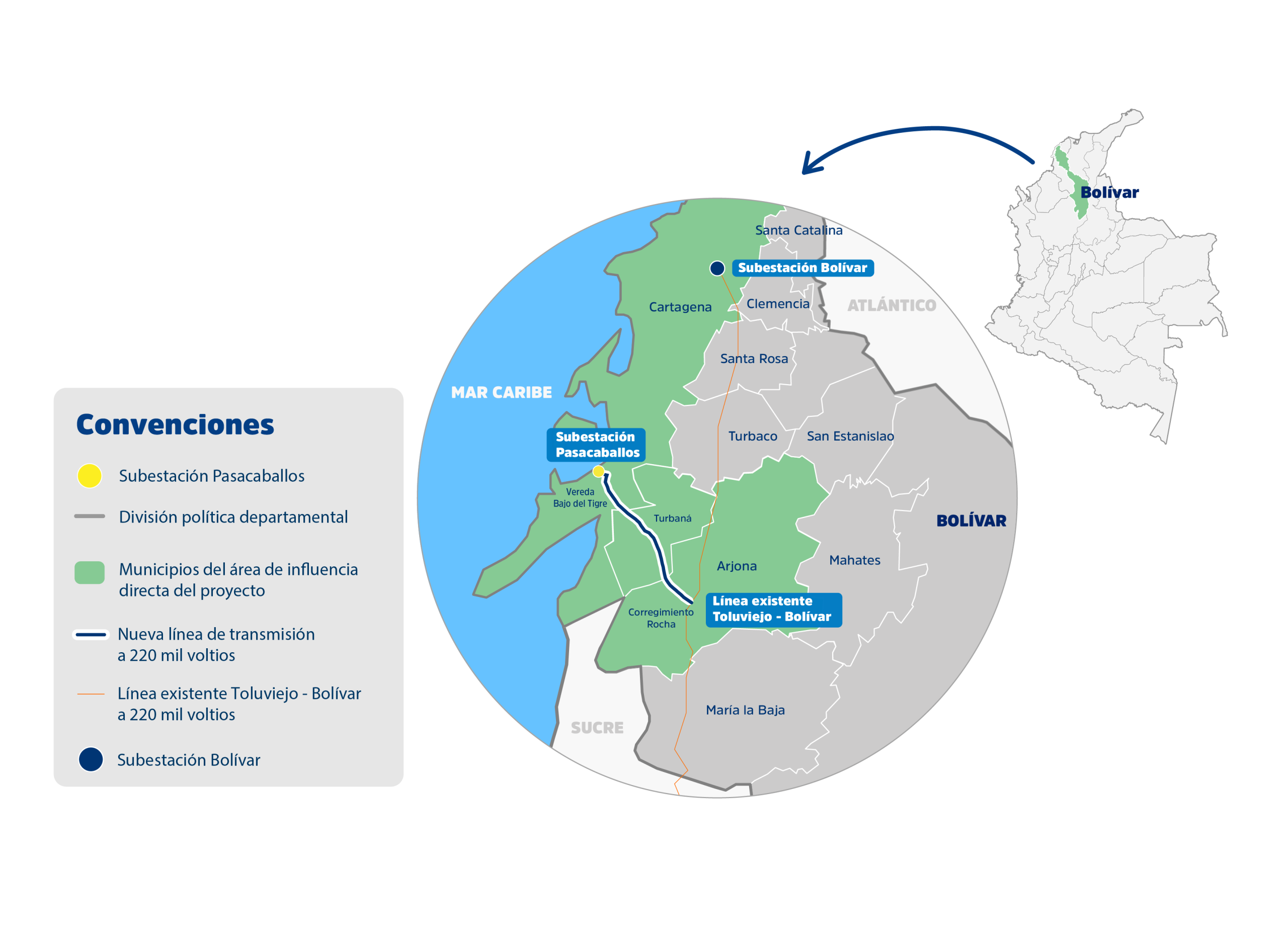 Se ubica en el departamento de Bolívar y su línea de transmisión recorre los municipios de Arjona y Turbaná hasta llegar a la nueva subestación Pasacaballos en el sur de Cartagena.