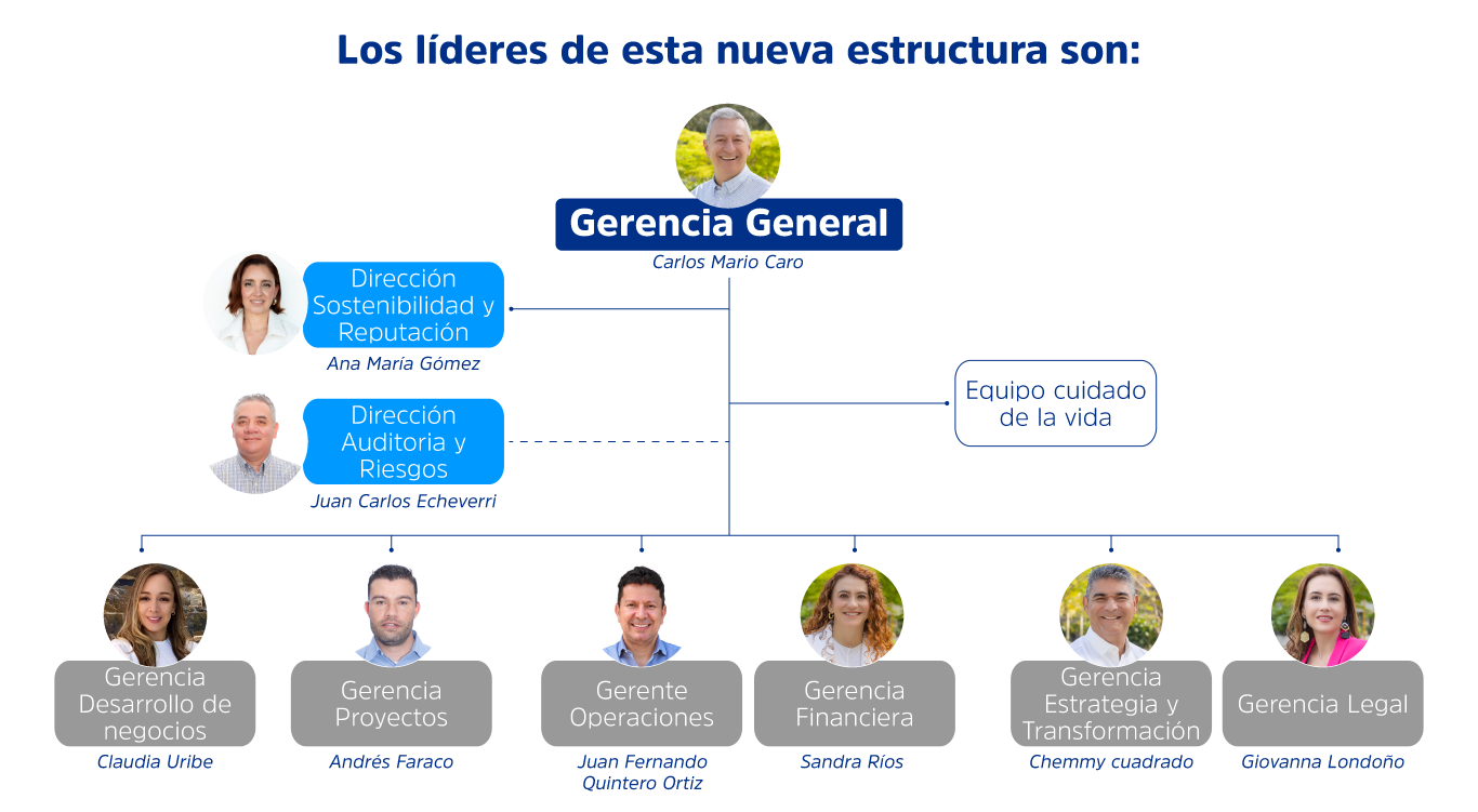 Nuestra Compañía cuenta con una estructura organizacional que inicia en la Junta Directiva, continúa en la Gerencia General y se despliega a las unidades que dependen de la Gerencia General y demás unidades dependientes.